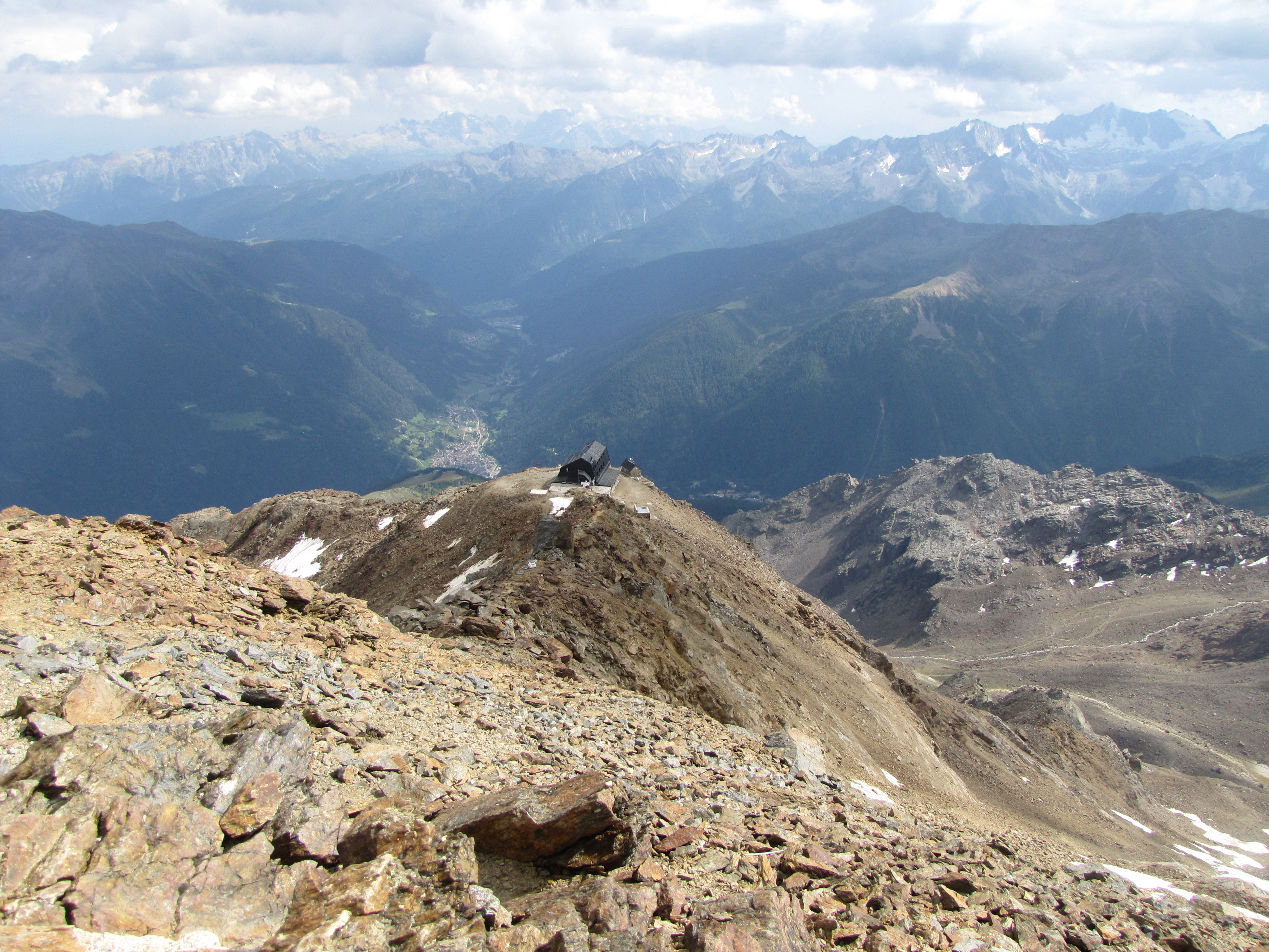 Monte Vioz is a 3645 meters mountain in the Ortlers in Northern Italy. Due to global warming one can reach the summit in summer without any special equipment. The Rifugio Mantova is located just 100 meters below the summit.